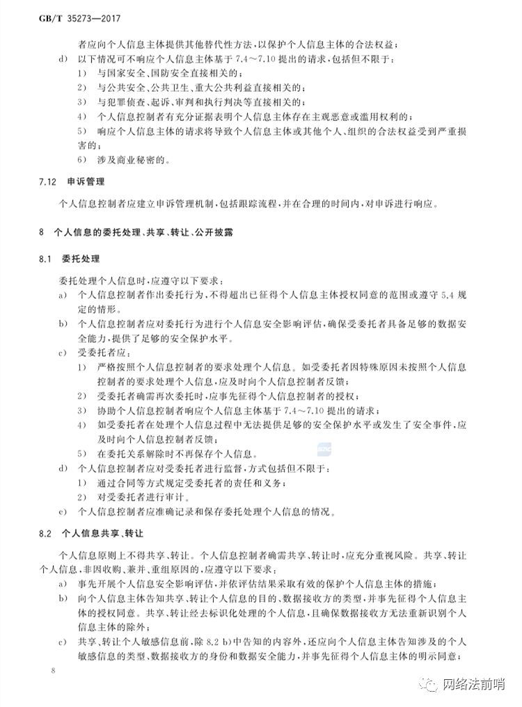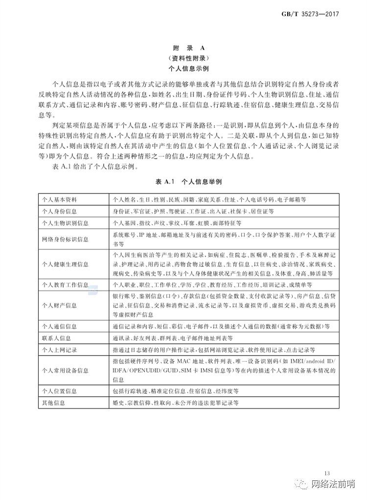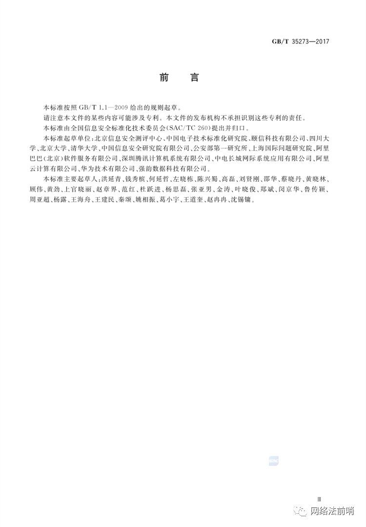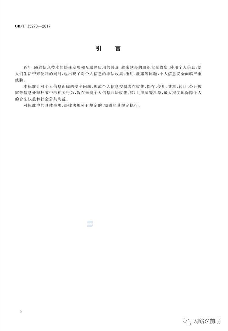 2017年12月29日,全国信息安全标准化技术委员会归口的《信息安全技术 个人信息安全规范》(GB/T 35273-2017)国家标准正式发布,该标准是推荐性国家标准,将于2018年5月1日正式实施。近日,国家标准全文公开系统上线该标准,以下是该标准正式发布版全文,也可点击“阅读原文”在线查看。
