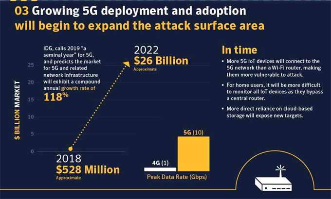 虽然智能手机是5G兴趣的焦点,但在未来一年,5G手机的数量可能会受到限制。作为广泛部署5G蜂窝网络的垫脚石,一些运营商正在为家庭提供固定的5G移动热点和配备5G的路由器。鉴于5G网络的峰值数据速率为10 Gbps,与4G的1 Gbps相比,向5G的转变将催生新的运营模式,新架构以及由此产生的新漏洞。