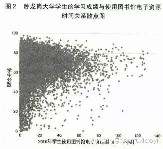 图 2 显示的是卧龙岗大学 21 000 多名学生的学习分数和使用图书馆电子资源时间的二维分布。每个点的横坐标表示该学生 2010 年使用图书馆电子资源的总时长(小时),而纵坐标表示该学生 2010 年度的加权平均分数。上述散点图呈现出一定形状,即随着使用图书馆电子资源时间的增加,学生的分数聚集层也在提升。