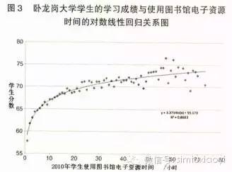 图 3 中每个点的横坐标代表卧龙岗大学学生 2010 年内使用图书馆电子资源的时间分组,如 0~1 小时、1~2 小时;纵坐标代表落入该分组的所有学生的平均成绩。如此简化后,便可以挖掘散点图中所隐藏的统计学意义上的关系。曲线代表的正是学生成绩与使用电子资源时间之间的对数线性回归关系,且回归方程y=3.371 4ln(x)+59.173的判定系数 R2=0.868 3,说明该曲线非常好地拟合了两者之间的关系。简言之,在卧龙岗大学,学生使用图书馆电子资源的时间越长,其学习成绩可能越好;或者,学习成绩越好的学生可能越长时间地使用图书馆的电子资源,这充分体现了高校图书馆的重要性和价值创造作用。