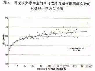 图4 与图3 类似,但其反映的是学生馆藏借阅次数与学习成绩之间的关系,借阅馆藏次数越多的学生的学习成绩可能越好。同样地,Cox和Jantti得出两者的对数线性回归方程y=2.439 3ln(x)+61.787,方程的判定系数R2=0.726 1,略小于前述方程的0.868 3。这表明图书馆纸质馆藏和电子信息资源与学生成绩之间的关系存在差异。Cox和Jantti指出造成上述差异的原因可能是:(1)2010 年卧龙岗大学有接近 30% 的学生没有借过 1 本书,而没使用电子资源的学生只有 8%;(2)馆藏借阅次数最多和使用电子资源时间最长的学生平均分数之间差别较大,且它们与相对应的从不借阅馆藏或使用电子资源的学生的平均分数之间的差距分别是 11 分和19 分。其实,这从另一个侧面反映出随着信息技术的不断发展人们信息使用习惯的变化,即电子资源比传统的纸质资源得到了更广泛和便利的使用,这为图书馆的信息资源建设传递了重要信号。 上述研究表明,一方面“图书馆立方”项目的开展非常有利于图书馆向学校管理委员会和其他上级机构很好地展示其为学校的教学活动创造的价值;另一方面也获得了一些预期之外的科学结论(如性别、年龄、成绩等社会变量与图书馆用户行为之间的关系),进而为图书馆未来的推广活动提供准确的细分目标群体,以提高活动的针对性和执行效率。3.2 “图书馆立方”项目的启示 如果从数据规模上讲,UWL 使用该校 21 000 多名在校学生的成绩数据、图书馆信息资源使用记录数据,还不能称之为“大”数据研究。但前文笔者总结的大数据思维特征在该研究中得到了全面的体现。Cox和Jantti采用全样本,即卧龙岗大学全体学生的图书馆访问、借阅数据及学习成绩数据,体现无偏性;在开展“图书馆立方”项目前,没有预先研究假设,体现开放性;将图书馆数据群与 PIU 成绩数据群联合分析,体现关联性;最后的研究结果很好地证明了规律性的存在。 关于研究学生学习成绩或学术成就与其使用图书馆信息资源之间关系的思路并不新颖,但过往的研究采用的研究方法是问卷调查、抽样调查等,导致研究结论的偏差性和部分信息的缺失,这些是代表性无法克服的缺陷。然而,随着信息技术的进步,研究方法和分析技术得到了极大的提高,全样本研究已成为可能,这不但解决了代表性难题,而且发现在“全样本”研究框架下,往往能获得更多的预期外的信息量和研究成果。例如,上述案例发现 2010 年卧龙岗大学完全没有使用电子资源的学生只占 8%,而没有借过一本图书的学生接近 30%,这反映出用户信息阅读习惯的趋势性变化。 如果 UWL 的目光仅限于自身的读者借阅数据,其也可以分析出馆藏文献流通的特征,如哪些类型、主题文献的借阅率高,但这是停留在结构化数据层次的分析。这样的分析报告很难向上级机构或其他有关管理机构展示图书馆的价值创造活动,也很难对 UWL 根据“图书馆立方”项目研究成果得到的细分目标群体展开有针对性、能够提升价值的图书馆服务推广活动。虽然国内图书馆目前尚无此方面的客观要求或主观目标,但这是图书馆未来会面临的现实问题。因此,图书馆非常有必要学习并内化大数据思维,不仅要关注自身的数据群,还应注重与其他组织数据群的互动,深入了解用户信息行为改变背后的信息需求变迁,考虑如何更好地整合图书馆的信息服务资源,以期发挥更大的效用,甚至可能引发一些服务内容或模式的变革。3.3 大数据思维在图书馆效益评价中的应用 国外关于图书馆经济价值的评价研究目前主要有两种方法:成本节约法(Cost Saving Approach)和条件价值估计法(Contingent Value Method)[11]。这两种方法都涉及到问卷调查,因此也就无法回避样本的代表性问题。 大数据思维一个重要的特征就是全样本,而这也正是信息技术进步对研究方法或研究范式所带来的发展。若干年前,受检索技术快速发展的冲击,图书馆业界思考 MARC格式是否过于复杂和精细以至包含了很多“无用”信息。但是,当大数据概念兴起和大数据思维不断被人们接受时,详细描述馆藏文献的 MARC 数据事实上是有“大用”的。以成本节约法为例,其介绍 MARC 数据如何可以准确且动态地评价图书馆的经济效益。成本节约法的逻辑很简单,假设图书馆不存在,读者使用图书、期刊等信息资源就必须通过其他渠道,所以可以把读者通过其他途径获得信息资源的成本视作图书馆“创造”的价值。就图书而言,图书馆作为公共的信息服务机构,借阅是免费的。当不能从图书馆借阅时,读者需要自行购买,或通过实体书店或网上书店购买。因此,如果某本图书一年流通了 N 次,而该图书的价格是 C 元,即图书馆在该本图书上创造的价值就是C*N 元。当完整的 MARC 数据和图书流通数据一关联,便可以准确地计算出某图书馆一年内所有图书创造的经济价值 V= ∑ Ci *Ni。在进一步深入评价时,还需要考虑加入购书的平均折扣系数和物价变动系数等,本文对此不作展开。 这个研究思路在过去是有的,但由于数据和技术的缺乏,只能退而求其次,采用统计调查法,但由于图书卷帙浩繁、品种万千,所得结论的可靠性常受质疑。现在大数据技术则可能很好地解决相关问题,甚至可以缩短到每月、每周动态地计算图书馆创造的馆藏价值。4 图书馆的“大数据”准备工作4.1 收集、存储相关数据 对图书馆而言,目前可以着手也是应该进行的工作是注