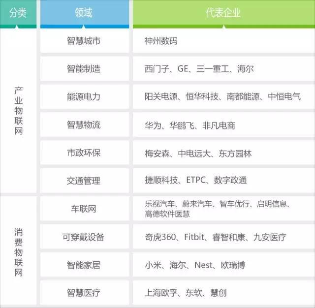 从业务分类看,物联网主要应用于车联网、智慧制造、智能家居、可穿戴设备等十大领域,如下表所示。这十个领域根据客户市场不同,又可为产业物联网和消费物联网两大类。