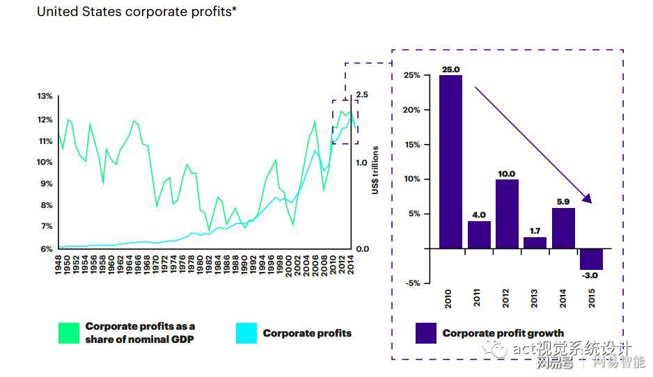 埃森哲的研究显示,到2035年,人工智能有潜力使公司的盈利能力平均提高38%,到2035年使12个经济体在16个行业的产出提高14万亿美元。但是,只有在企业怀着“以人为本”的心态,同时大胆且理智地将人工智能技术应用于其业务时,上述增长才有可能成为现实。我们的研究已经确定了8种跨行业策略,以帮助企业抓住人工智能的风口。目前企业利润率处于下降趋势,美国企业的利润率在2010年达到二战后最高水平至25%,然后又在2015年跌至-3%。
