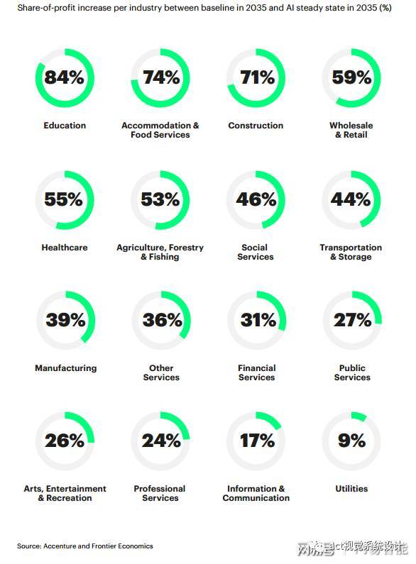 人工智能带来的经济产出的增长对涉及多行业领域企业的盈利能力意味着什么?根据我们的研究,到2035年,人工智能会把16个行业的盈利能力平均会提高38%。