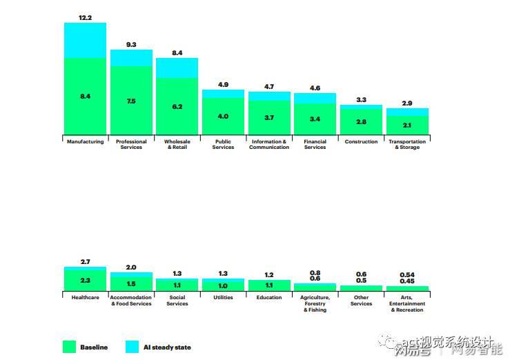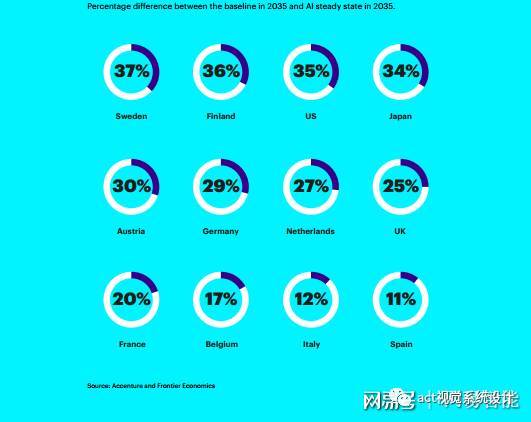 人工智能对国家的经济影响:我们的模型显示,在我们所分析的12个国家中,人工智能都有可能在2035年前使毛附加值的年增长率翻倍(毛附加值通常用于估算一个国家的GDP)。