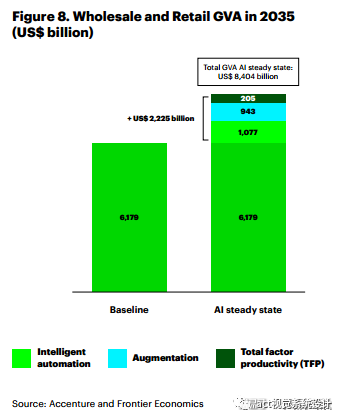 批发和零售业:在2035年,在批发和零售行业,人工智能可以产生超过2万亿美元的额外收益——与基线情况相比,这一数字增加了36%。零售商可以利用人工智能的自动化来优化库存和仓库管理,同时加强版的现实技术则可以让消费者沉浸在身临其境的购物体验中。在埃森哲研究的行业中,该行业预计可以从人工智能带来的额外创新效应中获益很多,比如说可以帮助公司发现潜在客户。