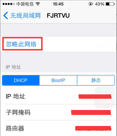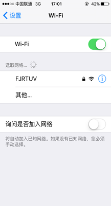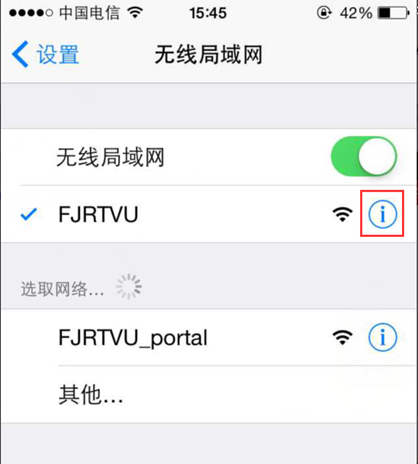 1.打开手机WIFI,点击“FJRTVU”后面的i图标,如下图红色框