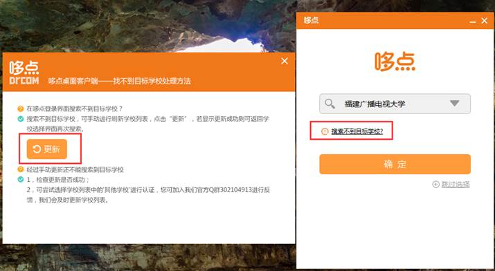 若搜索不到“福建广播电视大学”,请先点击【搜索不到目标学校】,在弹出界面中点击【更新】按钮,,然后再按上一步搜索学校。如下图