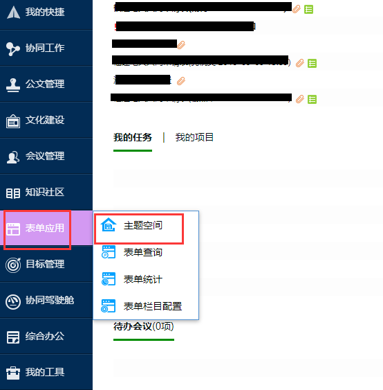 1. 登录OA系统,依次点击左侧菜单【表单应用】—【主题空间】,如下图所示。