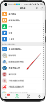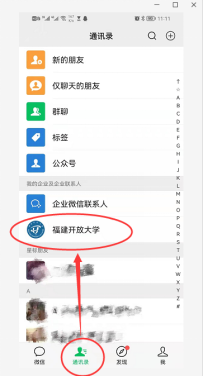 1、打开微信,依次点击【通讯录】-【我的企业级企业联系人】-【福建开放大学】,如下图: