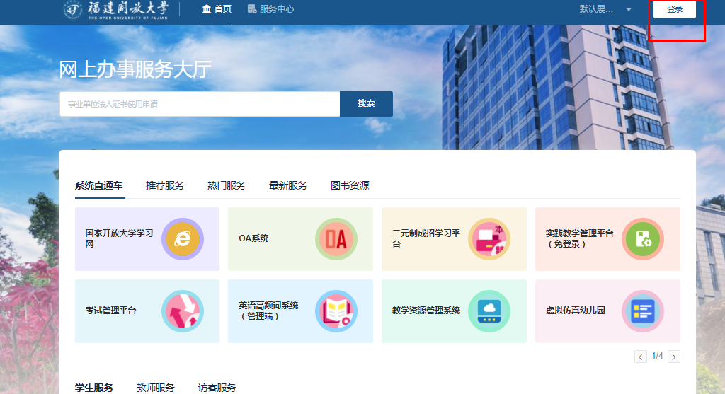 2、对于已关注“福建开放大学”微信企业号的,可直接点击右上角【登录】按钮,即可免密登录。
