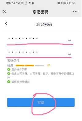 6、按要求输入两次新的密码(请牢记此密码),点击【完成】即可完成密码重置。